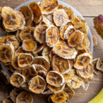 Experimente cortar a banana em rodelas finas para criar “moedas” fáceis de segurar.